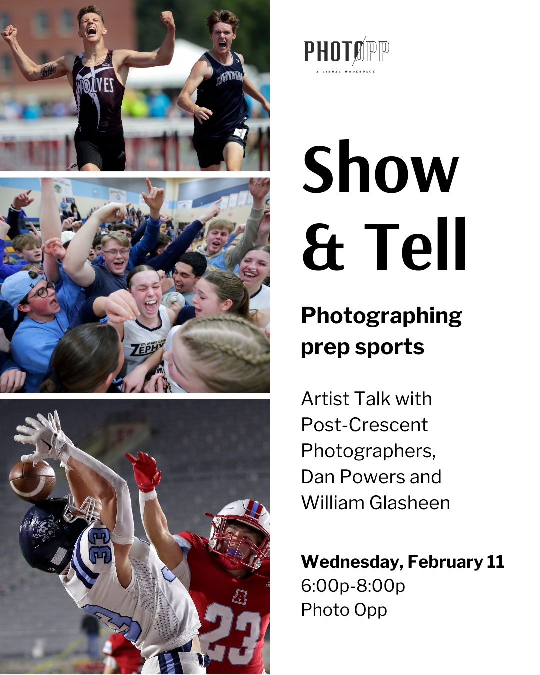 Show & Tell: Photographing Prep Sports Artist Talk with Post-Crescent Photographers Dan Powers and William Glasheen Wednesday, February 11, 2026 6:00 PM 8:00 PM Photo Opp 621 N Bateman Appleton, WI 54911 (map) Google Calendar ICS Join Post-Crescent photographers, Dan Power and William Glasheen as they share some of their favorite prep sports images and tell stories from their sideline views. Stay for the Q&A to ask your own questions and learn from their experience! Space is limited—RSVP now to save your seat! RSVPappreciated but not required